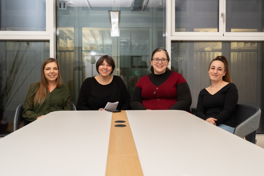 Die drei Beraterinnen Sarah, Laura und Bettina im Gespräch mit Juma-Lehrerin Ursula Schäublin.